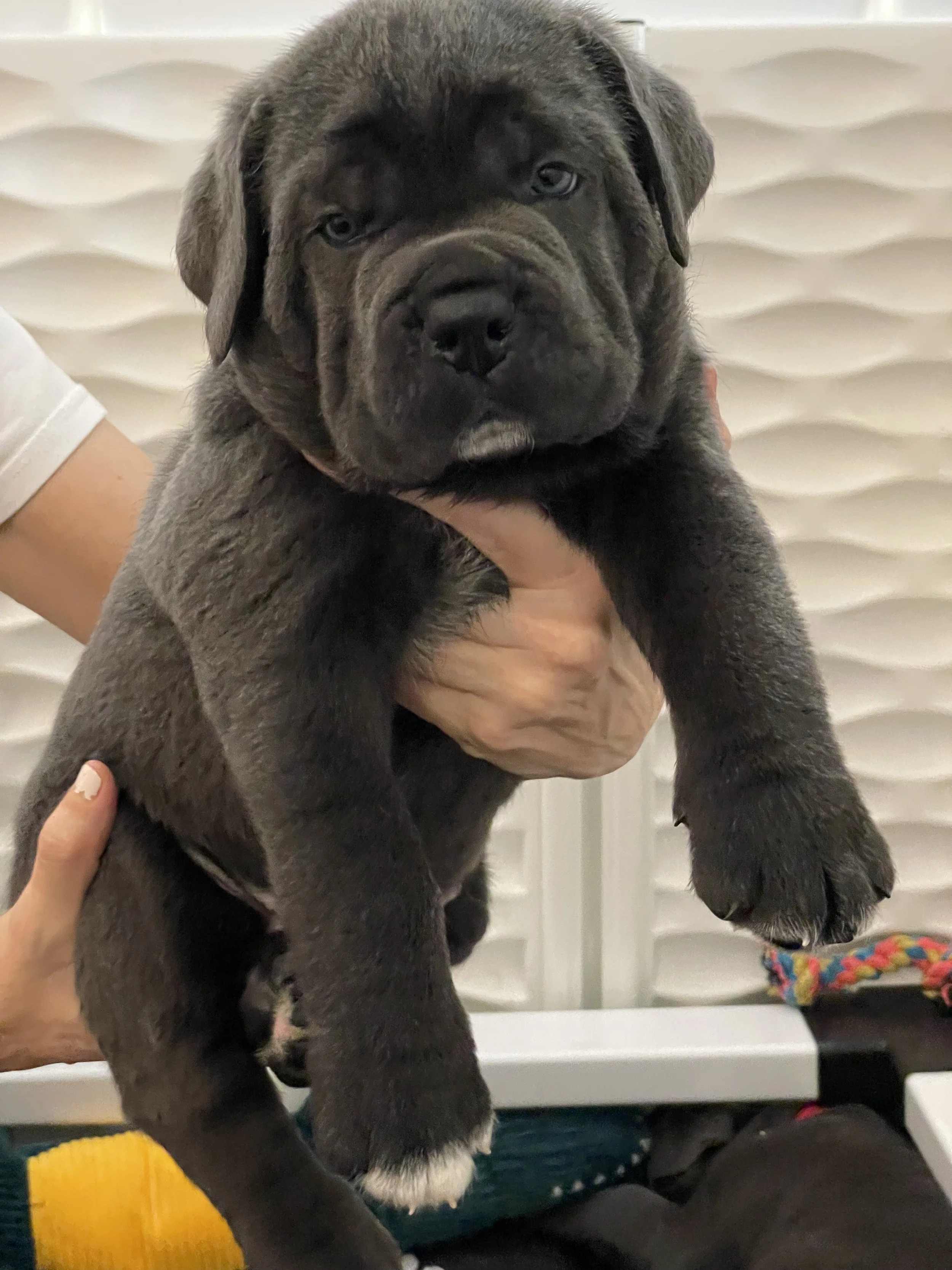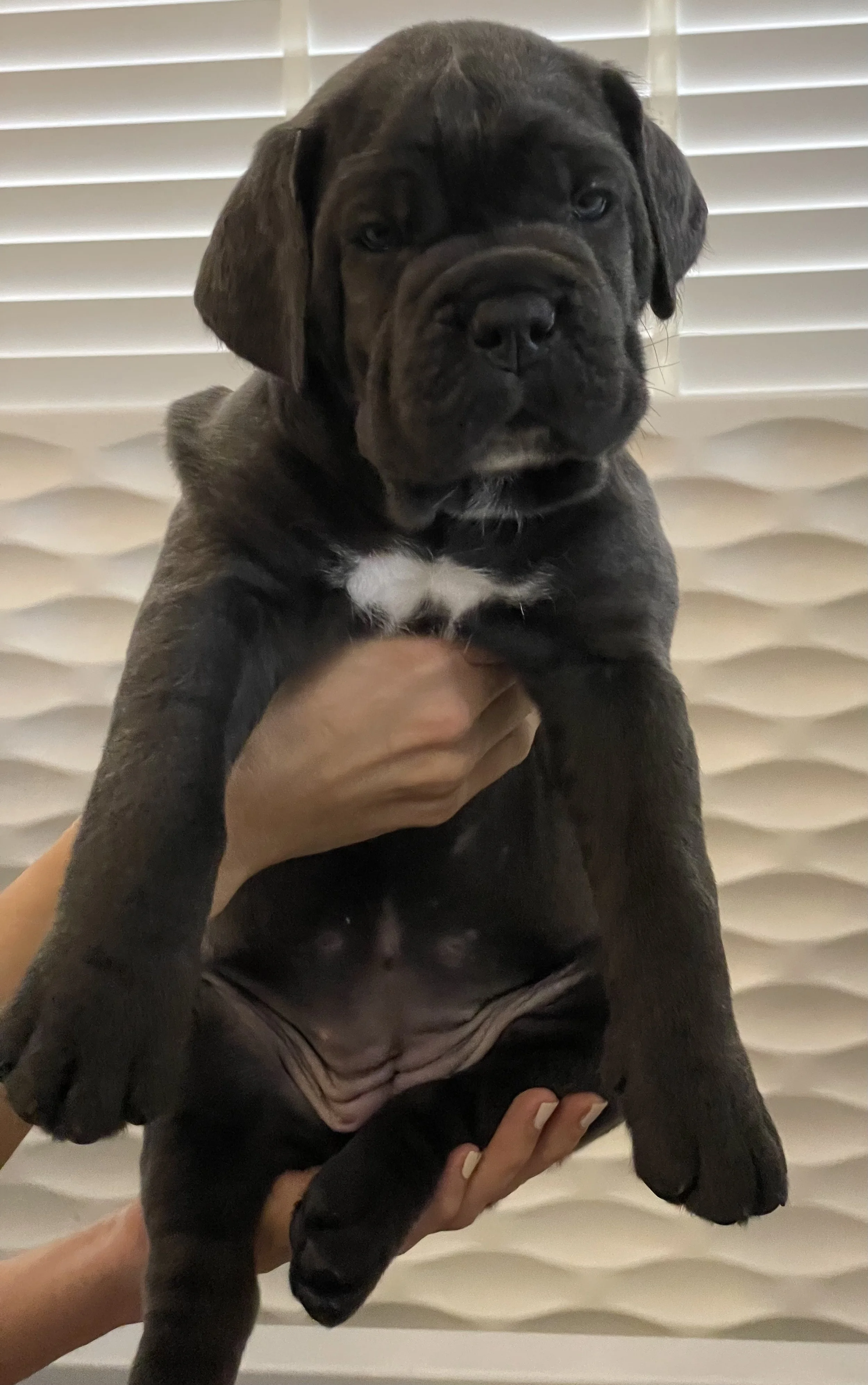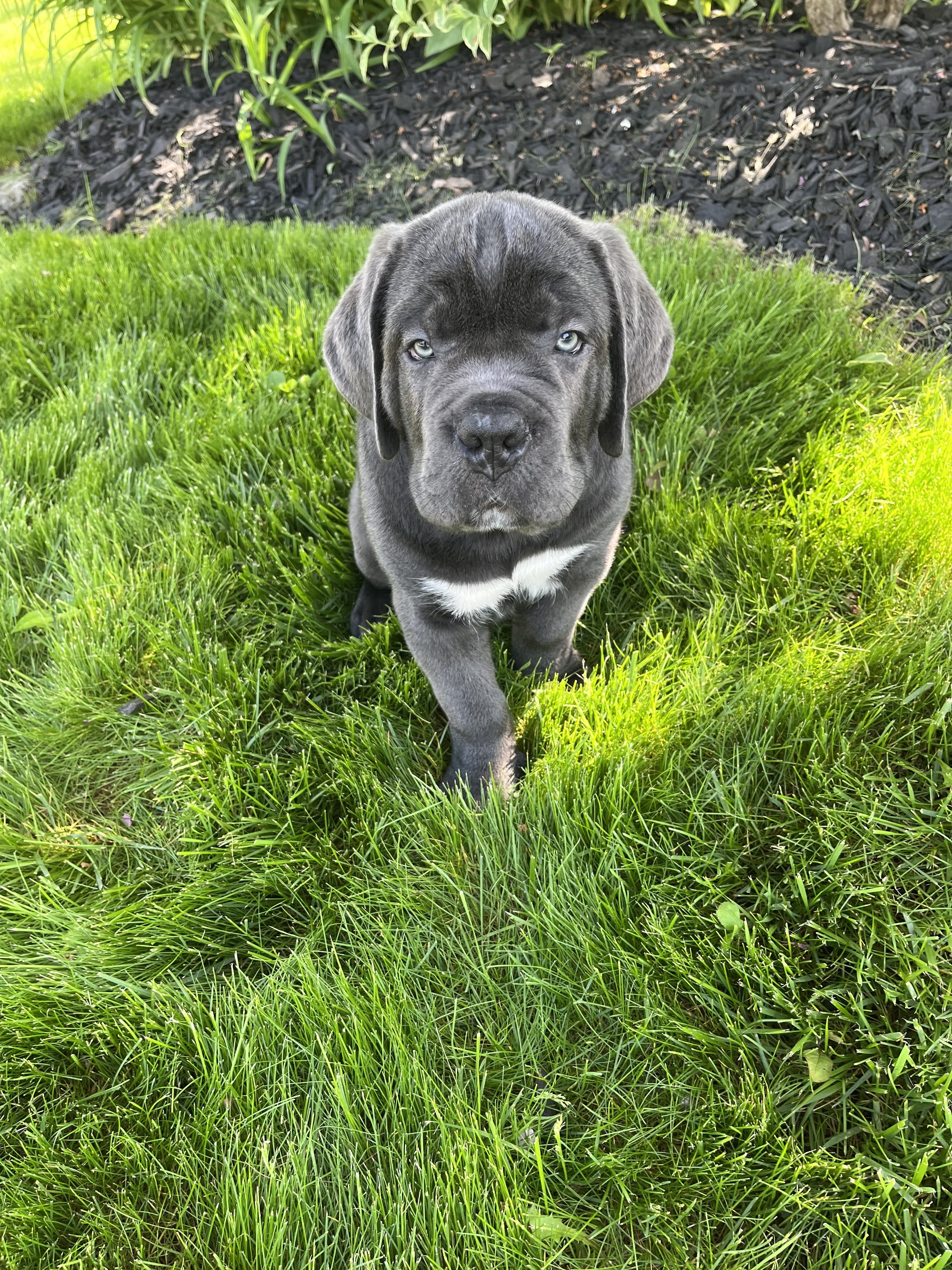 Introducing Dino, our endearing 4 month old male Cane Corso puppy adorned with a striking dark grey coat, mesmerizing blue eyes, and a distinctive white paw. Dino is a gentle soul with a heart of gold, known for his loving and affectionate nature. While he may be more reserved than his siblings, Dino isn't afraid to assert himself and stand his ground when needed. He's a loyal companion who cherishes cuddles from his humans and seeks out every opportunity to curl up into a welcoming lap. With his slightly longer fur and unique markings, Dino is as adorable as he is irresistible. Whether he's charming you with his affectionate nature or melting your heart with his soulful eyes, Dino is sure to become a cherished member of your family.