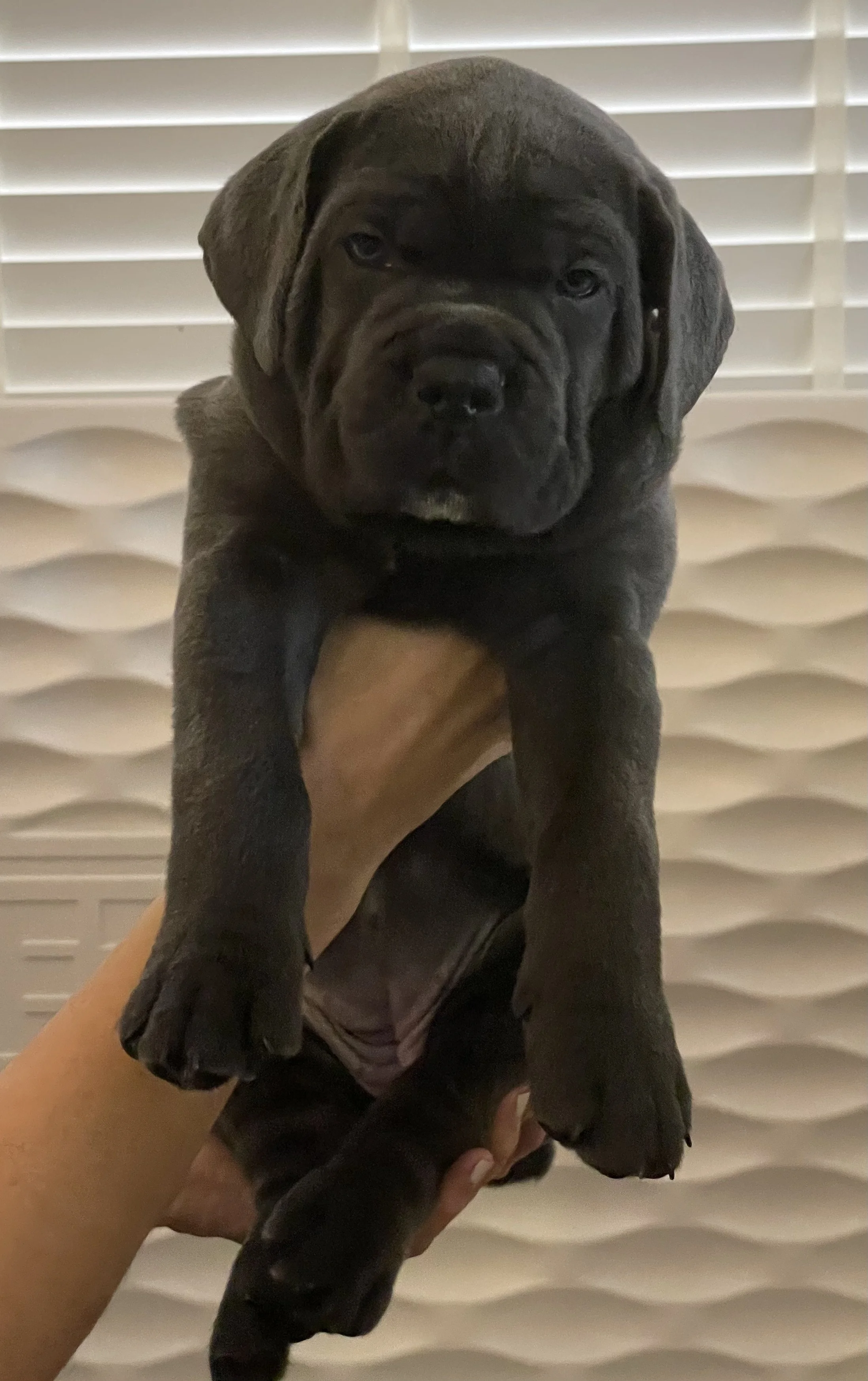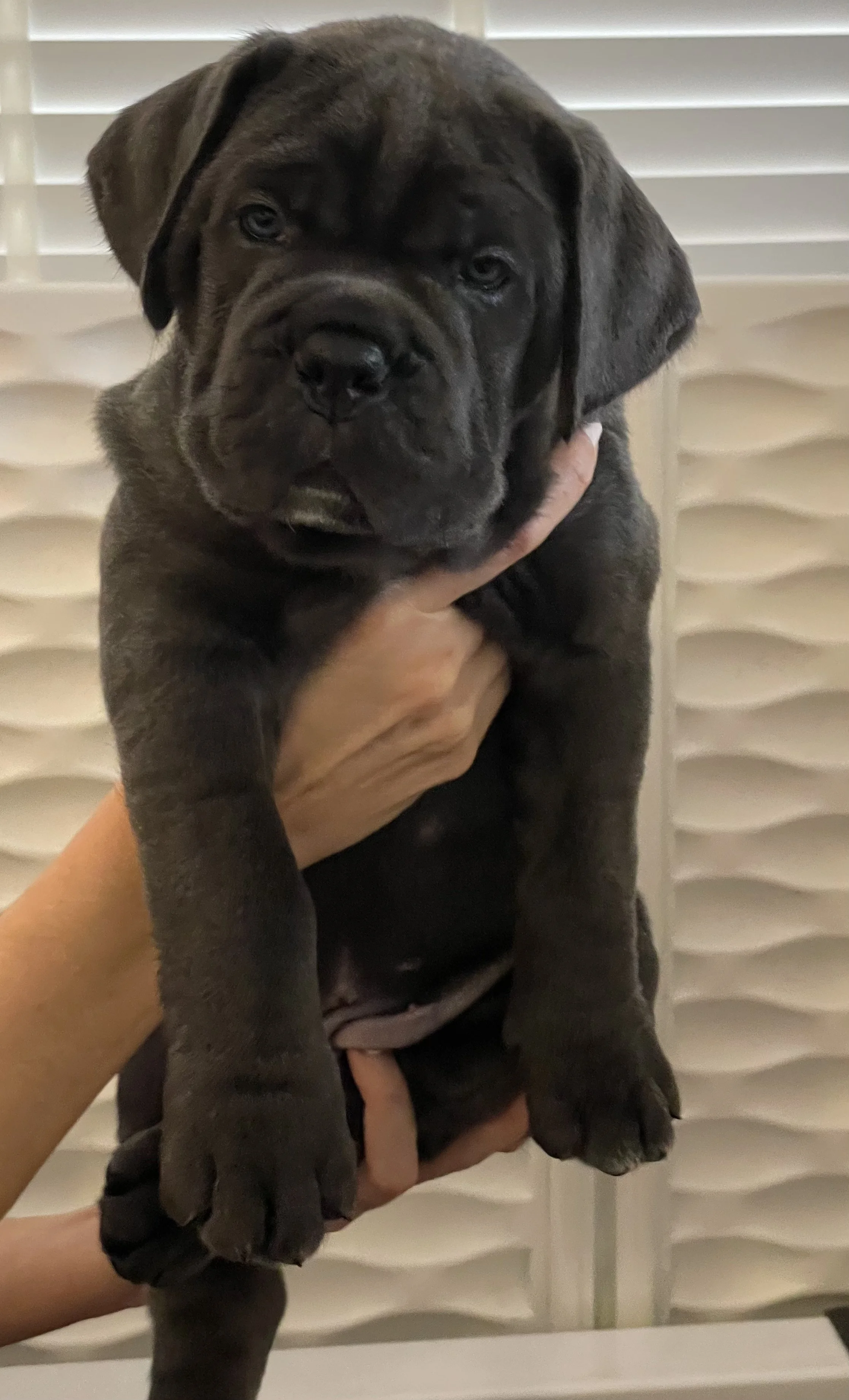 Meet Athena, our charming female Cane Corso puppy with a sleek dark grey coat and striking blue eyes. Athena is a bundle of personality, known for her playful antics and mischievous nature. Whether she's exploring her surroundings or getting into playful mischief, Athena's zest for life is infectious. When she's not busy exploring, Athena loves nothing more than cuddling up with her favourite humans for some quality snuggle time. With a hearty appetite and a love for playtime, Athena is sure to bring joy and laughter to her forever home.
