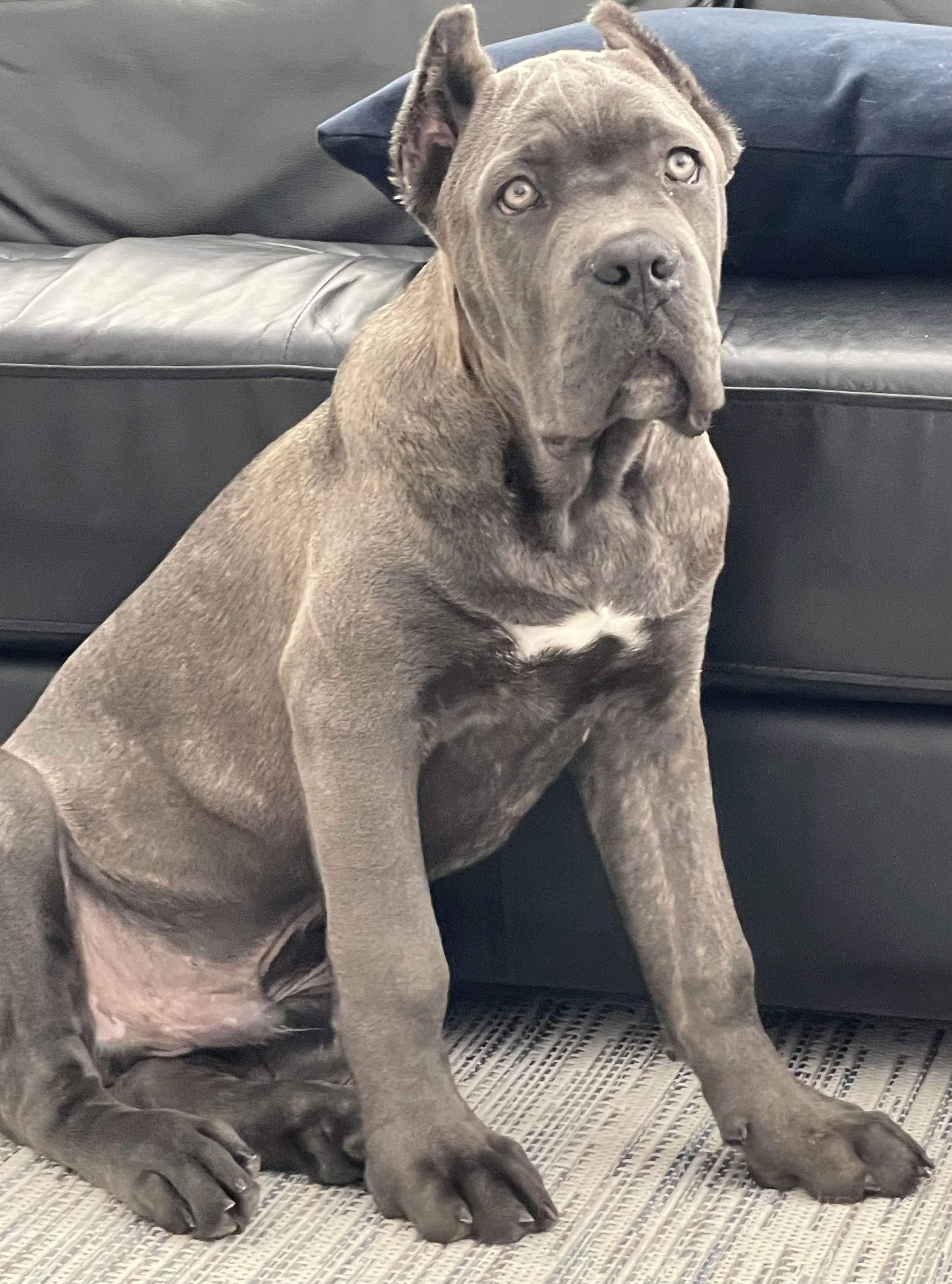 Introducing Dino, our endearing 4 month old male Cane Corso puppy adorned with a striking dark grey coat, mesmerizing blue eyes, and a distinctive white paw. Dino is a gentle soul with a heart of gold, known for his loving and affectionate nature. While he may be more reserved than his siblings, Dino isn't afraid to assert himself and stand his ground when needed. He's a loyal companion who cherishes cuddles from his humans and seeks out every opportunity to curl up into a welcoming lap. With his slightly longer fur and unique markings, Dino is as adorable as he is irresistible. Whether he's charming you with his affectionate nature or melting your heart with his soulful eyes, Dino is sure to become a cherished member of your family.