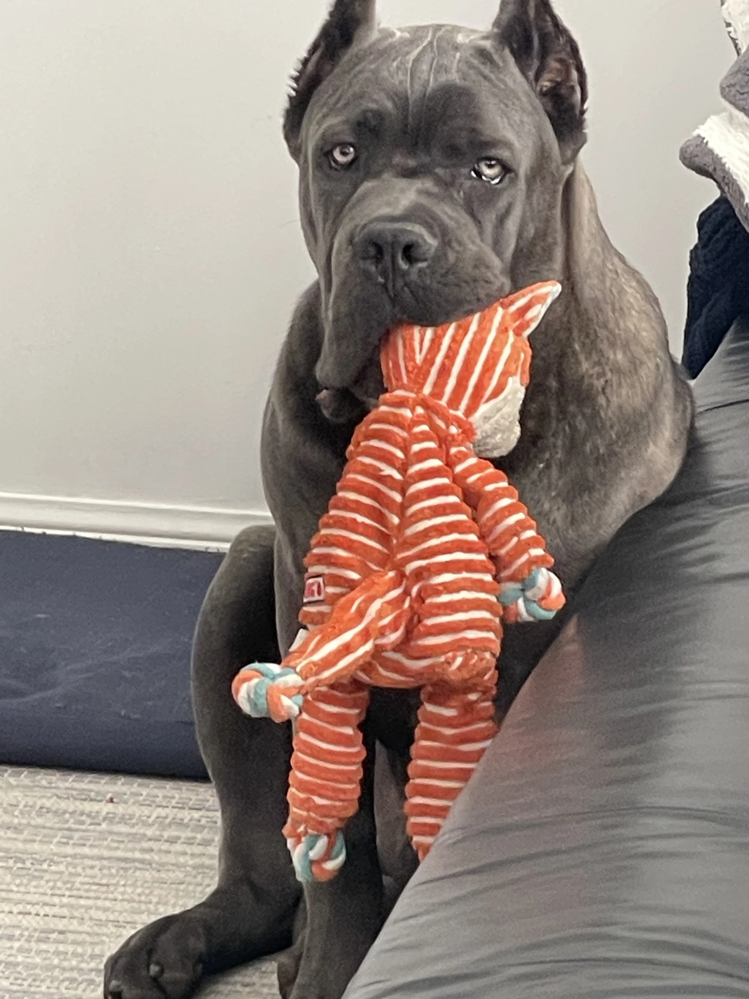 Blu holds registrations with both the American Kennel Club (AKC) and the International Cane Corso Federation (ICCF).